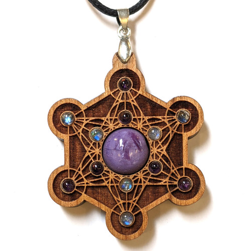 This Metatron's Cube Talisman is laser cut from Cherry Hardwood and has Charoite, Rainbow Moonstone and Amethyst inlaid into perfect geometry